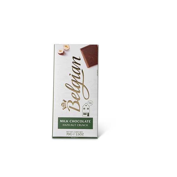 Discover the irresistible combination of smooth Belgian milk chocolate and crunchy hazelnut pieces. This 70g bar delivers a perfect balance of creamy sweetness and satisfying texture, making it the ultimate treat for chocolate lovers.