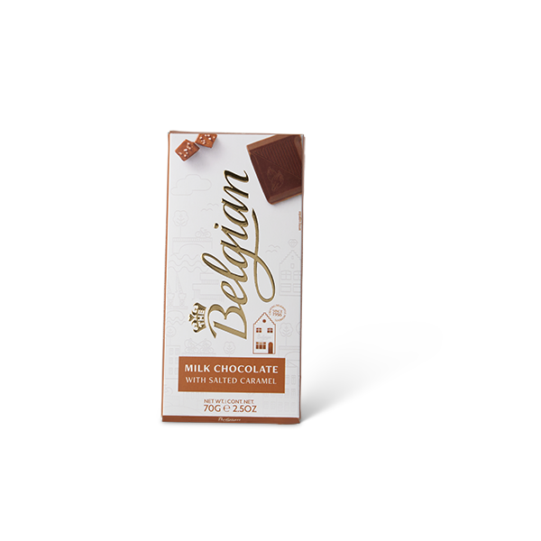 Ervaar de onweerstaanbare combinatie van romige Belgische melkchocolade en een vleugje zachte karamel met een hint van zout. Deze 70g reep biedt een perfecte balans tussen zoet en hartig, waardoor elke hap een unieke smaakbeleving wordt.